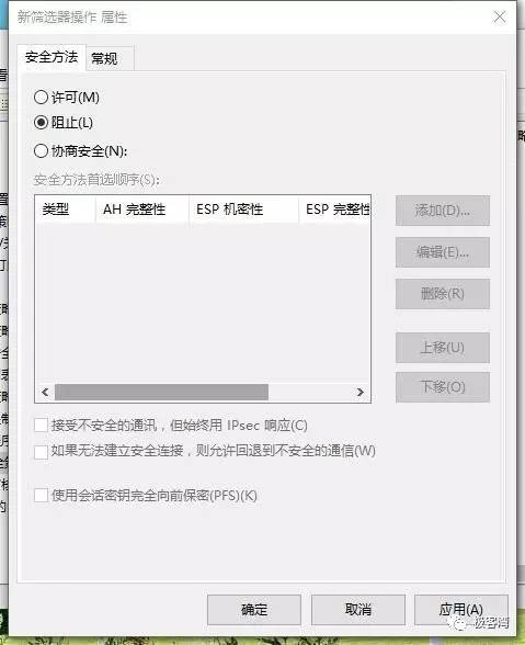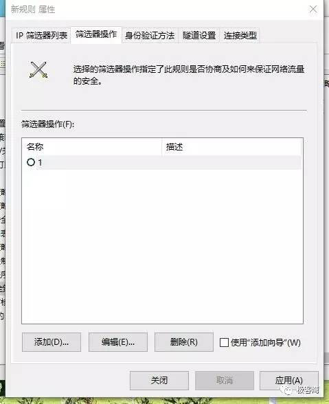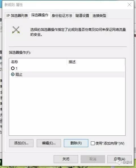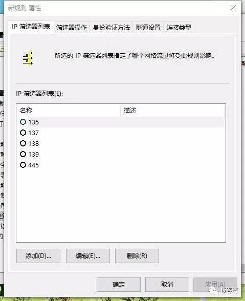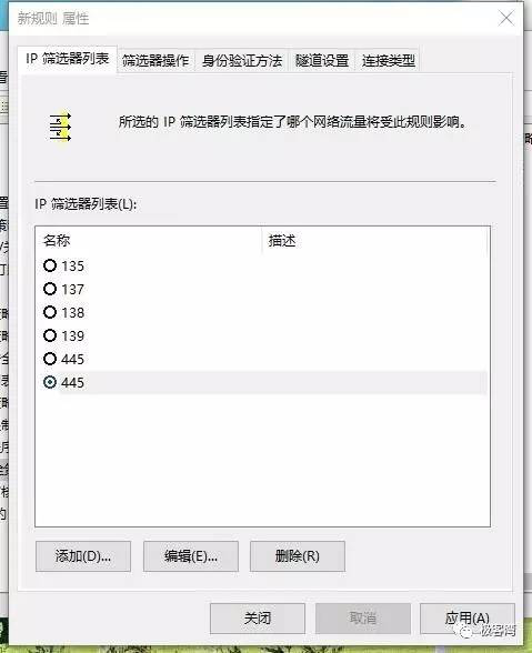 18、單擊確定,回到新規(guī)則屬性窗口中的篩選器操作,勾選剛才建立的“阻止”,在切換到IP篩選器列表,勾選剛才建立的“445”。然后單擊應(yīng)用,再單擊關(guān)閉。