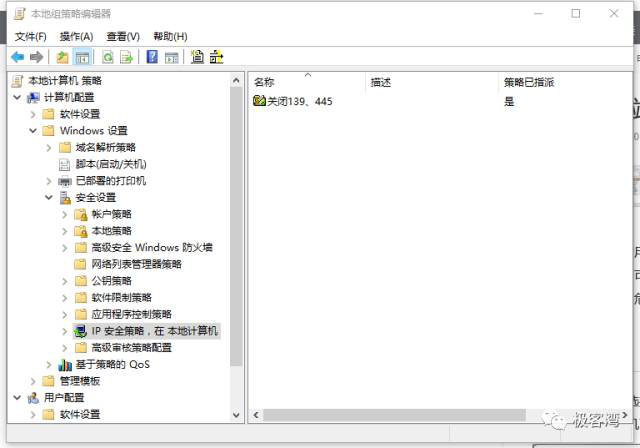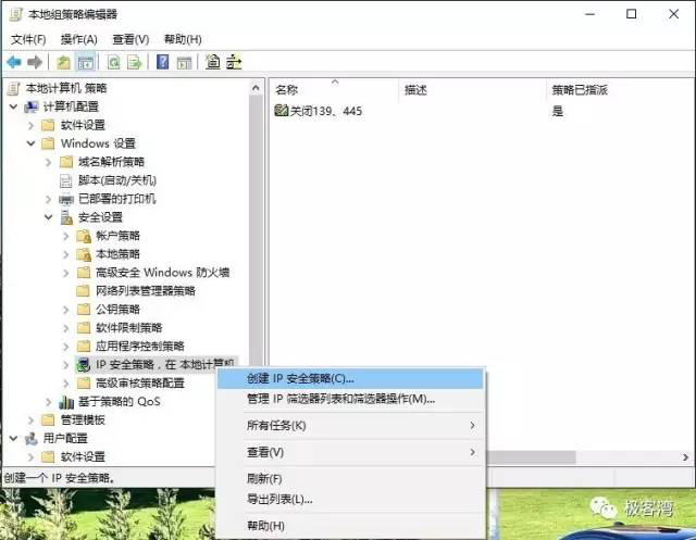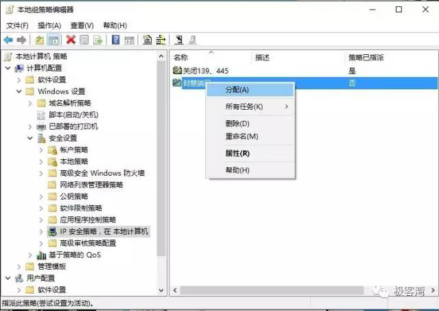 20、回到組策略編輯器,右鍵單擊右側(cè)剛才創(chuàng)建的“封禁端口”,在右鍵菜單當(dāng)中選擇分配,就成功關(guān)閉了445端口。