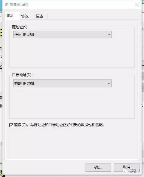 12、在彈出的IP篩選器屬性窗口的地址選項(xiàng)卡中,原地址選擇“任何IP地址”,目標(biāo)地址選擇“我的IP地址”。