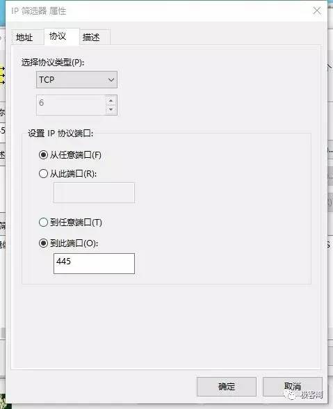 13、然后選擇協(xié)議選項(xiàng)卡,選擇協(xié)議類型為:TCP,設(shè)置IP協(xié)議端口為"從任意端口""到此端口":445,并單擊確定。