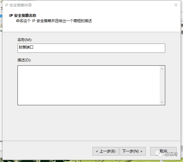 6、在第二步的名稱中輸入“封禁端口”然后一路“下一步”
