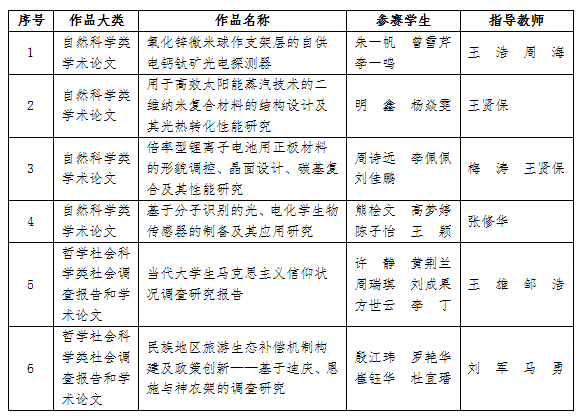 在湖北省第十二屆“挑戰杯”大學生課外學術科技作品競賽中,我校《氧化鋅微米球作支架層的自供電鈣鈦礦光電探測器》、《用于高效太陽能蒸汽技術的二維納米復合材料的結構設計及其光熱轉化性能研究》、《倍率型鋰離子電池用正極材料的形貌調控、晶面設計、碳基復合及其性能研究》、《基于分子識別的光、電化學生物傳感器的制備及其應用研究》四個項目獲得一等獎,《當代大學生馬克思主義信仰狀況調查研究報告》、《民族地區旅游生態補償機制構建及政策創新》兩個項目獲得二等獎,以上六個項目將代表我校參加第十六屆“挑戰杯”全國大學生課外學術科技作品競賽。