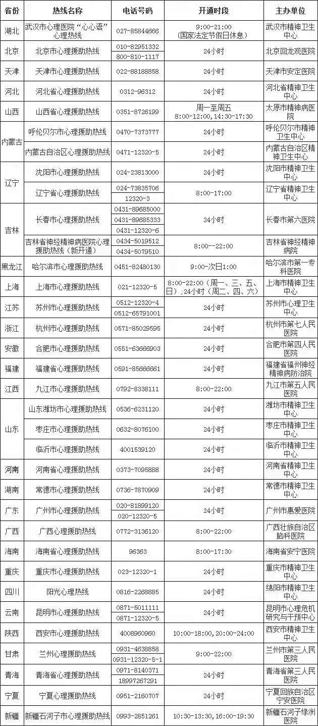鑒于在疫情發展中及控制后對心理干預的大量需求,我們同時提供全國心理援助熱線電話,供我校因新型冠狀病毒感染的肺炎疫情產生心理壓力、急需情緒緩解的學生使用。
