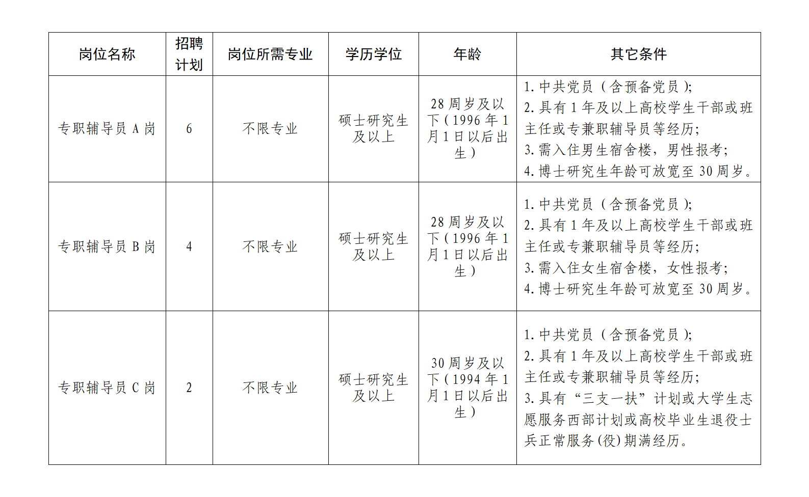 根據學校事業發展需要,現面向社會公開招聘專職輔導員12人,具體崗位及條件詳見下表。