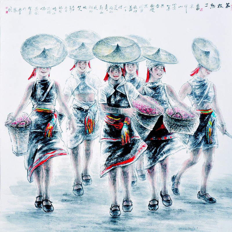 胡智勇是一個(gè)畫(huà)家,更是一個(gè)文人。他熱愛(ài)藝術(shù),更熱愛(ài)生活,并努力在生活中尋找藝術(shù)的意義。因此他十分善于觀察生活,特別是令他感動(dòng)的事物,他總是樂(lè)此不疲去表現(xiàn)。在他的創(chuàng)作中,女人成為他最關(guān)注的題材。在智勇看來(lái),女人能頂半邊天,女人的世界既是神秘的又是美麗的。女人承載了世界上最美的東西——無(wú)私奉獻(xiàn)、善良勤勞以及那無(wú)盡的柔美。為此,他創(chuàng)作了大量描繪婦女的題材,特別是創(chuàng)作了大量以少數(shù)民族人物為主要題材的作品。對(duì)少數(shù)民族題材的熱衷出于他對(duì)少數(shù)民族有著特殊感情,他每年都要去云南、鄂西與少數(shù)民族過(guò)春節(jié)。在與少數(shù)民族的一起生活接觸的過(guò)程中,少數(shù)民族的服裝服飾、風(fēng)俗習(xí)慣、音容笑貌都深深地印入在他的腦海之中。在那個(gè)世界里,他感受到了城市之中已經(jīng)消失的某種文化。而這種文化曾經(jīng)是人類(lèi)最寶貴的財(cái)富之一。在那個(gè)世界里,他更感受到了少數(shù)民族那種獨(dú)特的善良美麗,這種感覺(jué)深深吸引著智勇。他曾多次參加彝族傣族的潑水節(jié),并創(chuàng)作了以潑水節(jié)為題材的系列組畫(huà)——《祈福之水》、《吉祥之水》、《水的祈福》、《水的祝福》等,以及表現(xiàn)少數(shù)民族日常生活場(chǎng)景的作品——《有陽(yáng)光的果園》、《果香時(shí)節(jié)》、《果園深深》、《荔枝熟了》、《生命鼓舞》等。在這些作品中,人物臉上洋溢的喜悅與笑容是給人的印象是令人難忘的,幾乎所有作品的人物表情都是如此。這種微笑我們似乎可以從周思聰先生的作品中找到,在一般人看來(lái),她們的這種形象似乎更接近文革時(shí)期的人物形象——勤勞、質(zhì)樸、憨厚,而在我看來(lái),這種微笑不正是人們對(duì)當(dāng)下美好生活的一種贊美么?不正是對(duì)勞動(dòng)人民的肯定和贊美么?不正是對(duì)和諧家園的最好的表現(xiàn)么?