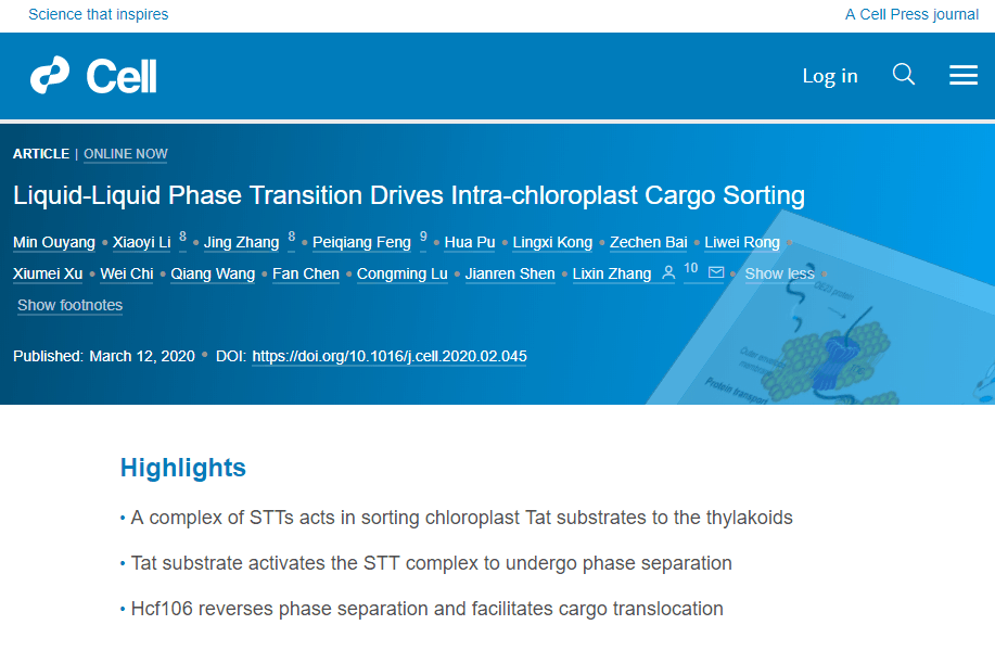 3月13日,湖北大學生命科學學院、省部共建生物催化與酶工程國家重點實驗室歐陽敏教授在國際頂級期刊《Cell》上發表題為“Liquid-liquid phase transition drives intra-chloroplast cargo sorting ”(《液-液相分離調控葉綠體蛋白的運輸和分選》)的研究論文。該論文由湖北大學,中科院植物研究所以及河南大學共同完成,歐陽敏教授為本文唯一第一作者,中科院植物研究所張立新教授為通訊作者。這是湖北大學教師首次以第一作者身份在《Cell》上發表研究論文(見圖1)。