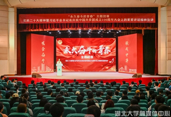 從南湖紅船到天安門城樓,從李大釗同志被捕入獄到無數(shù)革命先烈前仆后繼……以音傳情,以歌敘史。近日,團省委副書記陳立一行赴湖北大學講授“永久奮斗的青春”主題團課。團課以共青團跟黨奮斗的光榮歷史為線索展開,通過沉浸式體驗和藝術(shù)式呈現(xiàn),與團員青年共同追憶初心使命,拉開全校團員青年學習貫徹習近平新時代中國特色社會主義思想主題教育的帷幕。校黨委副書記侯勇出席活動。