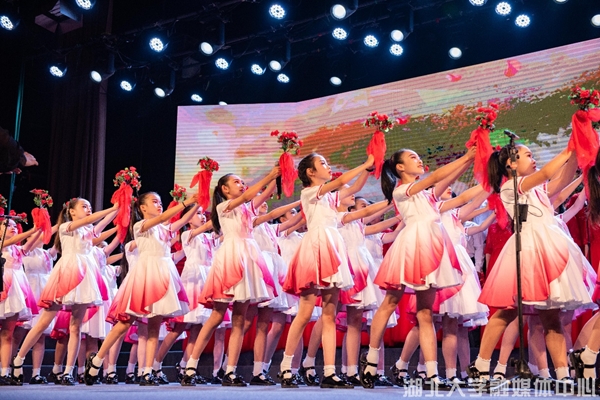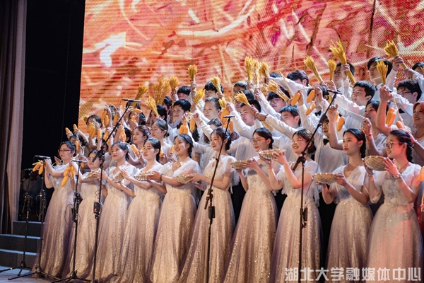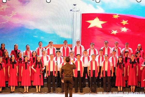 “夜半三更呦,盼天明。寒冬臘月呦,盼春風?!焙贝髮W附屬小學一曲《映山紅》,稚嫩的童聲穿透現場。湖北大學機關、楚才(創新創業)學院聯合演唱了《我愛你中國》,他們隨著旋律一齊搖動,臉上的笑容感染著近千名觀眾,引得全場揮舞手中的紅旗,跟隨他們齊唱。師范學院、曼城聯合學院《在希望的田野上》,生命科學學院、化學化工學院、材料科學與工程學院《我和我的祖國》,后勤集團《走向復興》等歌頌了新時代闊步向前的豪邁氣概,唱出了新時代師生對祖國的深情。